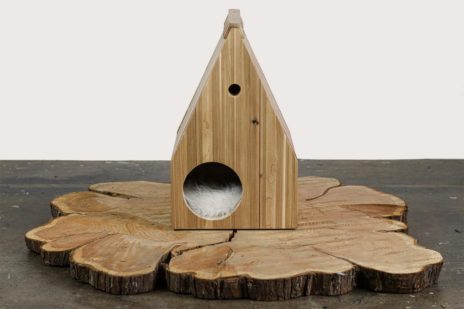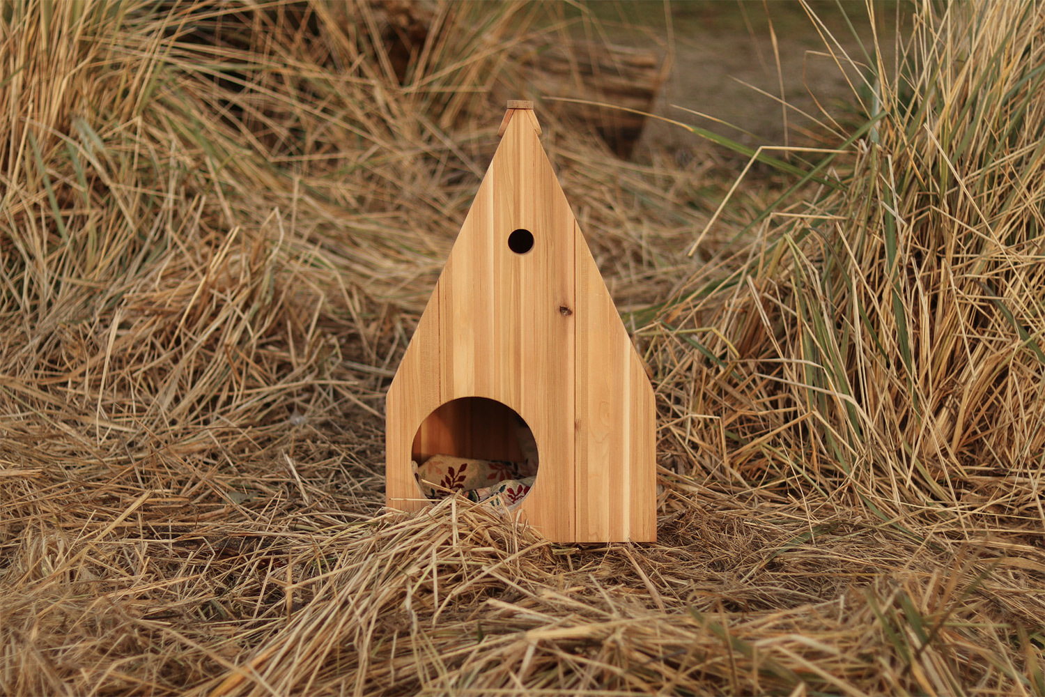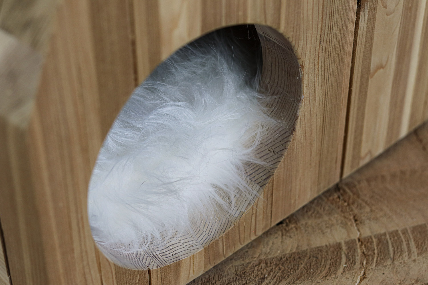 Is it a birdhouse or a KITI house? Cedar plank facade and circle door, polar fluff interior, what else defines the KITI DANISH CHALET? The mute swan is the national bird of Denmark, it’s a fact. To see a documentary video of a kitty and swan, click here.