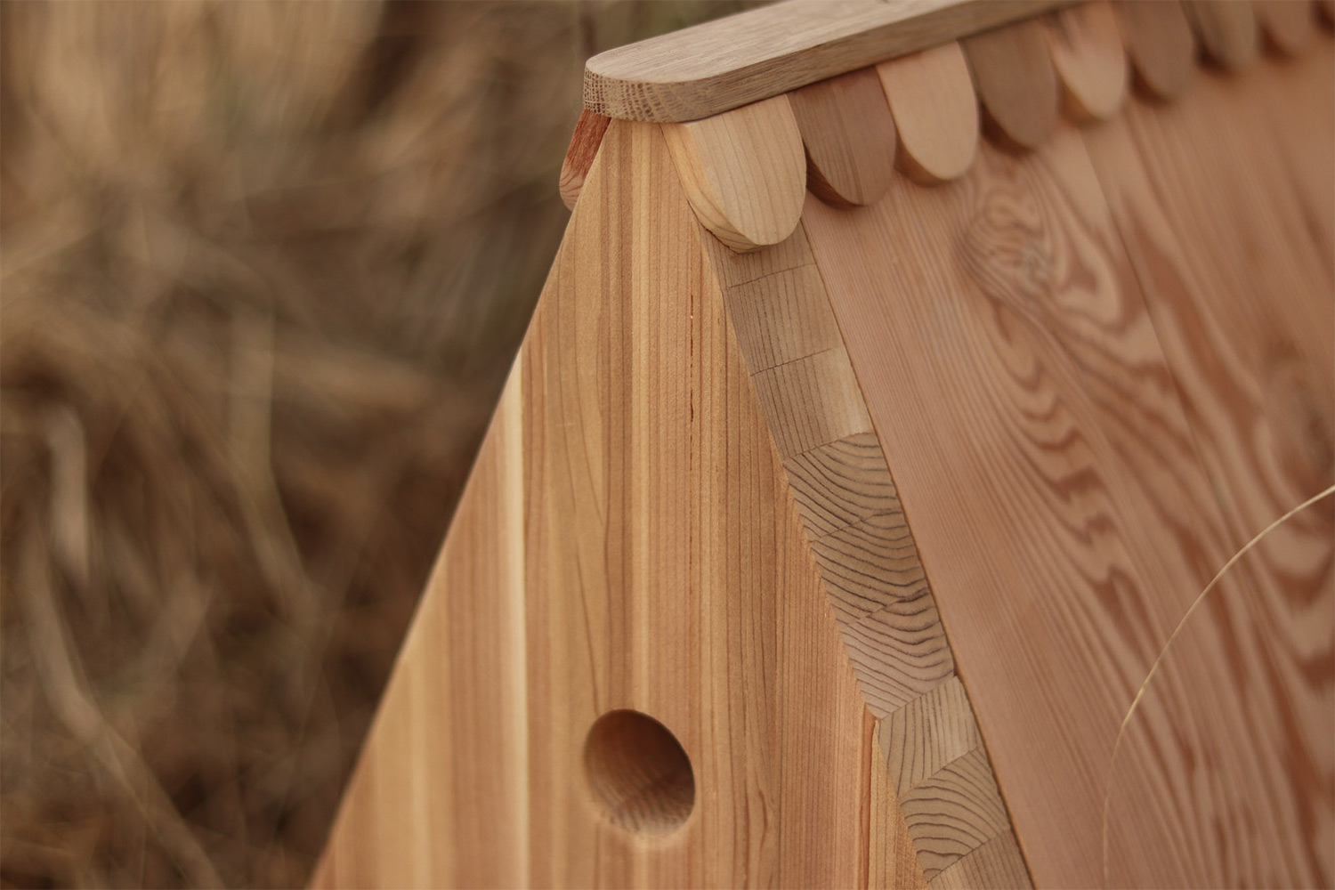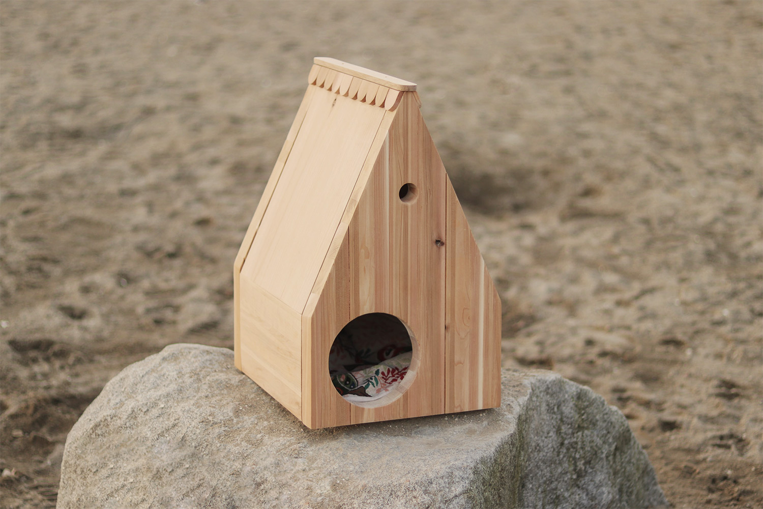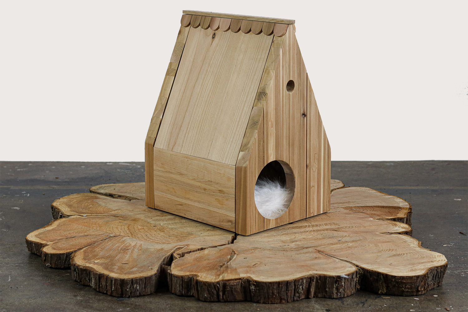 Is it a birdhouse or a KITI house? Cedar plank facade and circle door, polar fluff interior, what else defines the KITI DANISH CHALET? The mute swan is the national bird of Denmark, it’s a fact. To see a documentary video of a kitty and swan, click here.
