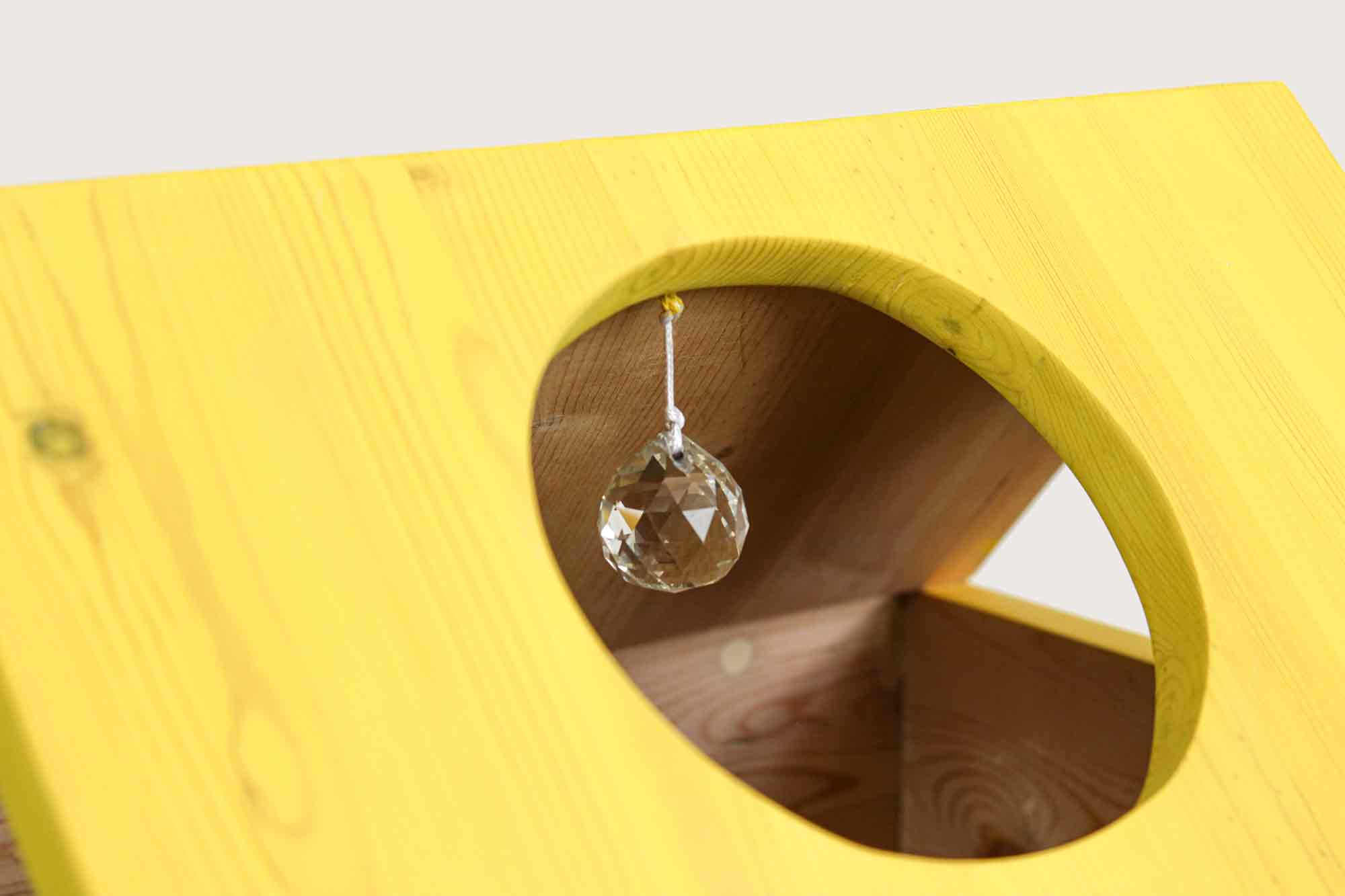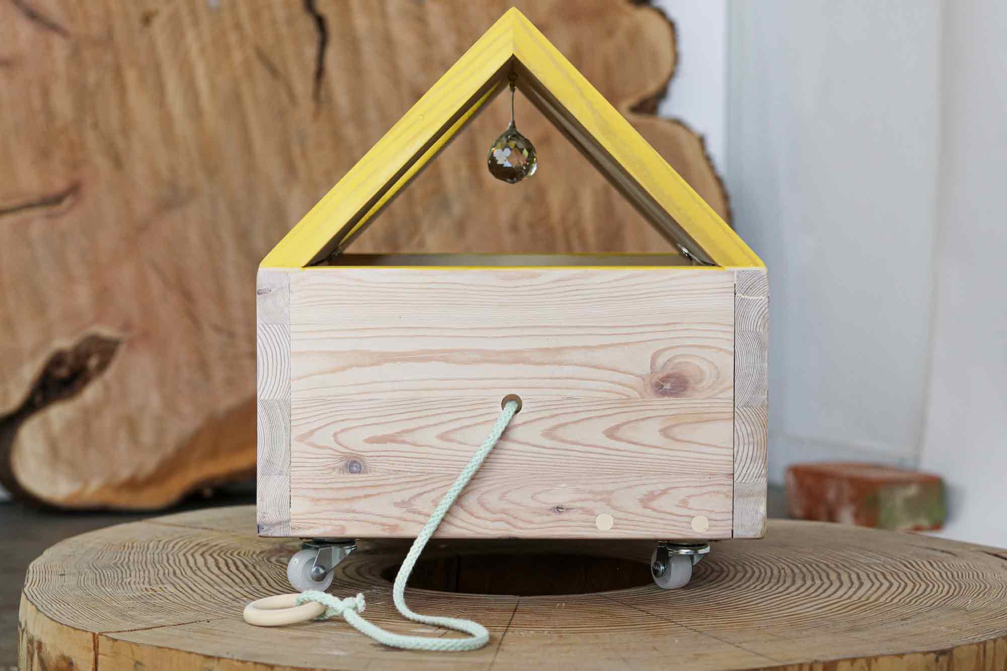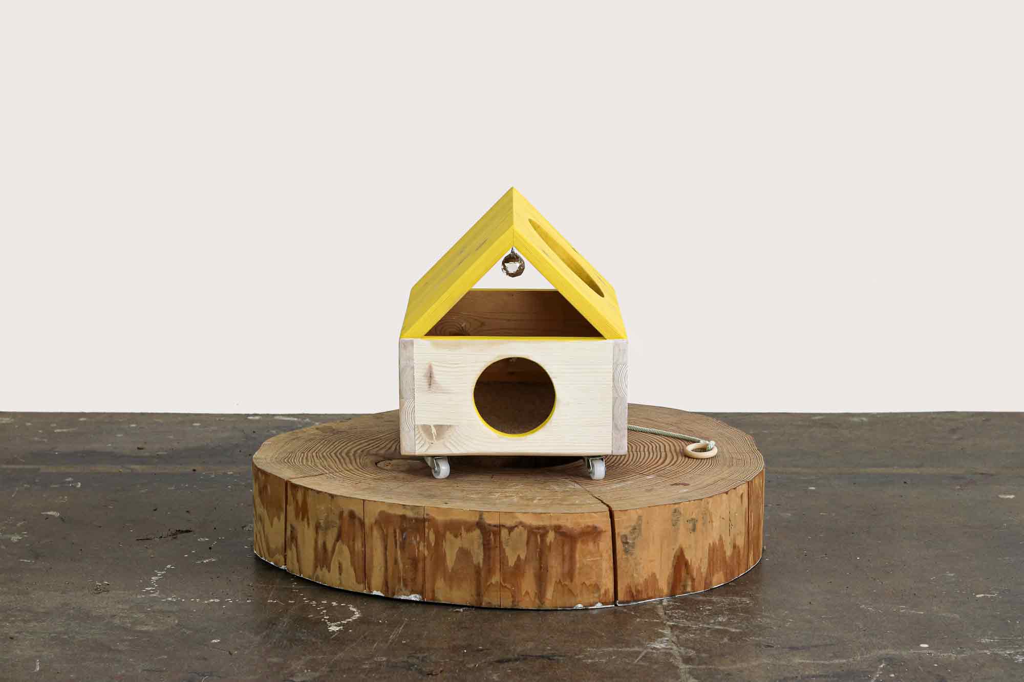 The KITI SUN DISCO CHALET has a disco ball, wheels, and a pull string so you can roll around your kitty in it. For a small kitty.